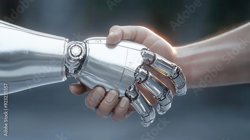 Worker and robot shaking hands under a digital contract, symbolizing labor rights, sci-fi, silver tones, 3D rendering, tech lab.--s 250
