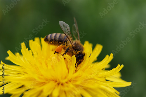 worker bee collects nectar and pollen from a dandelion flower
