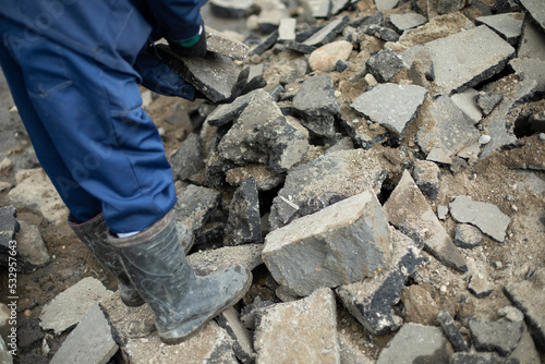 Worker carries stone. Cleaning of construction waste. Broken stone.