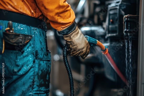 Worker cleaning machinery with high-pressure water hose. Illustrates industrial cleaning, maintenance, and safety.