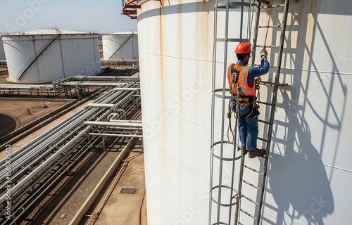 Worker climbs ladder attached to large oil storage tank at processing facility showing industrial maintenance activity