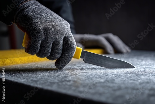 Worker Cutting Aluminum Foil Foam Board with Knife – Close-Up of Construction Material Handling