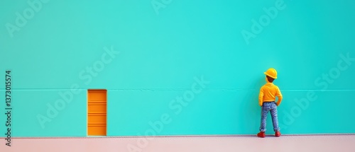 Worker examines empty wall in vibrant setting