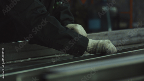 Worker hands in grey protective gloves handling long metal profiles on a workbench, highlighting precision fabrication, industrial craftsmanship and safety in a busy workshop setting