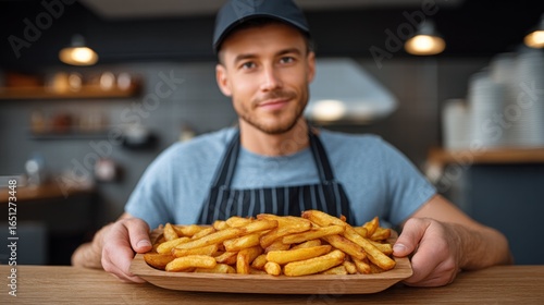 Worker Holding Freshly Fried Potatoes in a Restaurant Kitchen Quality Check Culinary Environment Close-Up View