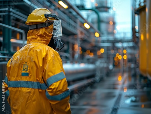 Worker in a chemical plant conducting inspections. Safety protocols, industrial setting. Engineering and manufacturing. Minimalism,