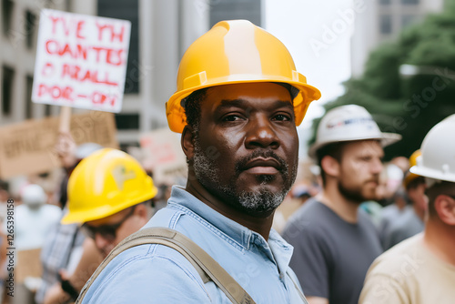 Worker in a hard hat stands amidst a crowd, possibly during a demonstration or rally, wearing safety gear and displaying a determined expression.