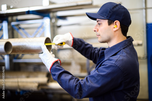 Worker in an industrial plant measuring the size of a pipe