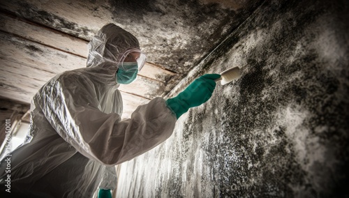 Worker in Protective Suit Removing Mold from Indoor Wall with Brush