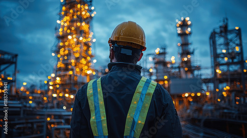 worker in reflective jacket and hard hat observes illuminated industrial refinery at dusk, highlighting intricate network of pipes and structures