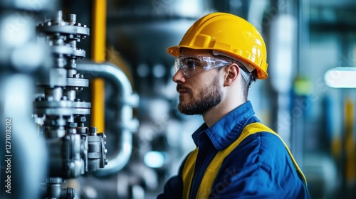 Worker in safety gear inspecting machinery in a modern industrial facility