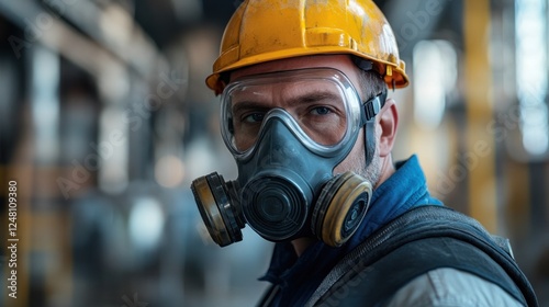 Worker in safety gear with a mask and helmet in an industrial setting.