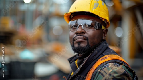 Worker in warehouse or a construction worker in orange safety vest and helmet standing on a construction site.