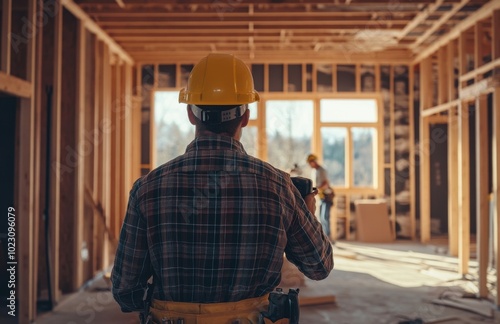 Worker in yellow hard hat holding tools, construction site with unfinished house in background, man's back, his checked shirt visible, interior view of house under construction, wooden beams visible