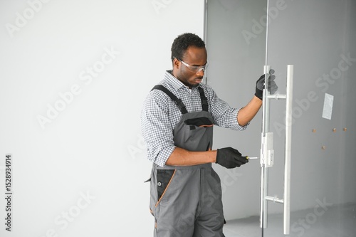 Worker installing glass door at office