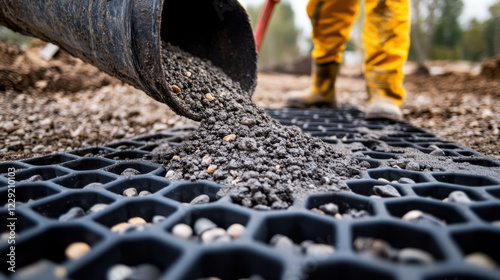 worker is pouring gravel into grid structure, creating stable surface for construction. scene captures effort and precision involved in landscaping
