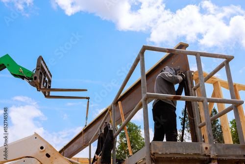 Worker is welding metal beams on construction site, focusing intently on task under works day