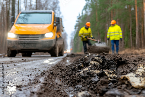Worker operates jackhammer on muddy road during road construction amidst trees and vehicles
