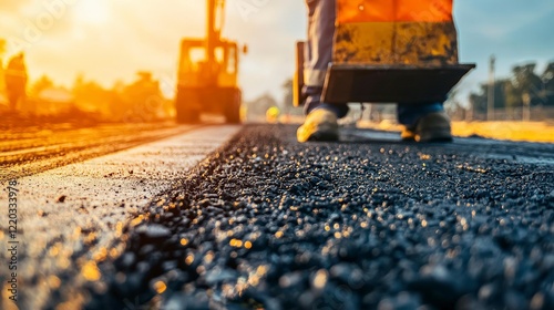 Worker Operating Heavy Machinery on Fresh Asphalt Road Construction