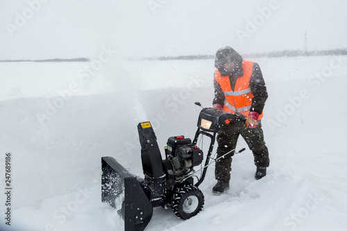 Worker operator snow plow on snow removal