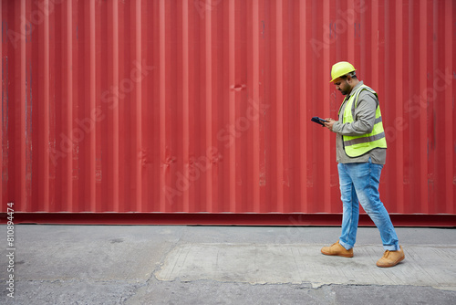 worker or engineer walking forward and working on tablet in containers warehouse storage