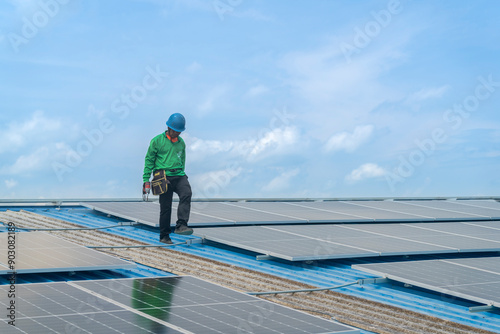 Worker Technicians are working to construct solar panels system on roof. Installing solar photovoltaic panel system. Men technicians walking on roof structure to check photovoltaic solar modules.