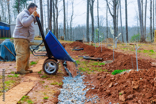 Worker uses a wheelbarrow to fill over drainage pipes with crushed stone