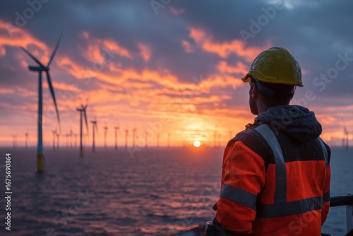 Worker watches a breathtaking sunset at an offshore wind farm while standing amidst wind turbines