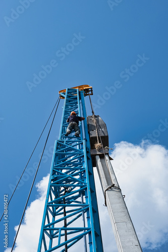Worker wear orange helmet climb very high crane in hot day for pile.