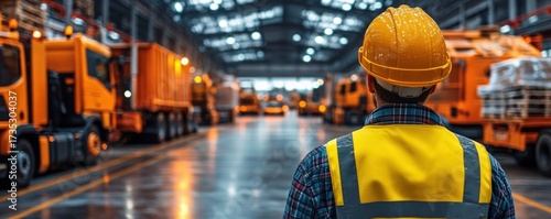 Worker wearing yellow safety vest and helmet observing multiple orange trucks inside a large industrial warehouse with high ceilings and bright lighting
