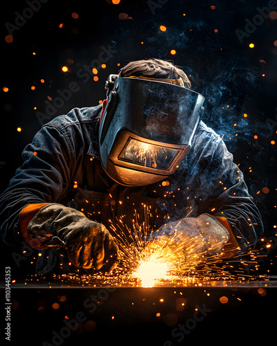 worker while doing a welding with arc welder welding or welding Sparks for background, Backdrop and manufacturing.