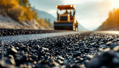 Workers and heavy equipment lay fresh asphalt on a gravel road in a dynamic construction scene.