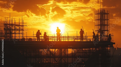 Workers assembling a bridge at sunrise, their silhouettes standing out against the golden light, scaffolding and beams creating intricate patterns, serene yet industrious atmosphere,