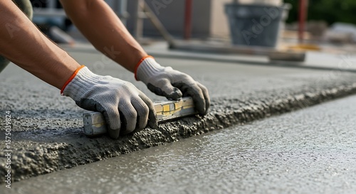 Worker’s gloved hands leveling wet concrete on pavement, construction site close-up