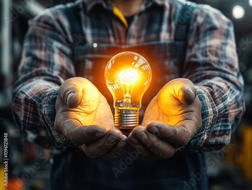 Workers hand holding a glowing light bulb, symbolizing innovation and labors role in progress