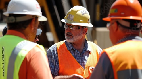 Workers in hard hats and vests discussing improvements in a factory environment.