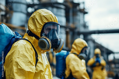 Workers in hazmat suits performing safety protocols in a chemical plant, highlighting precautions and risk management in hazardous environments.