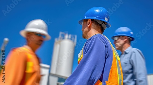 Workers in Industrial Setting Wearing Safety Gear Under Clear Sky