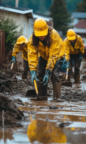 Workers in yellow suits shoveling mud.