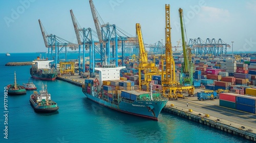 workers, industrial port, with ships, cranes, and containers