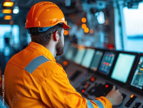 Workers installing advanced navigation equipment on a vessel bridge, modern ship technology, maritime electronics