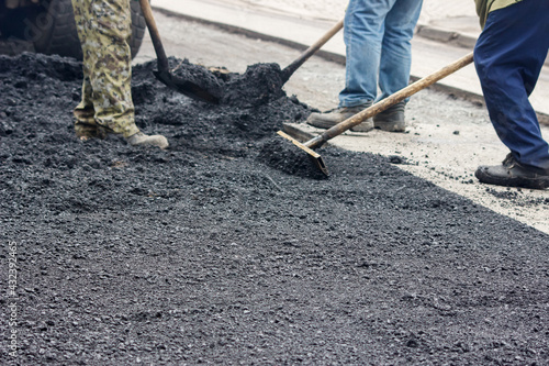 workers laying hot asphalt on the road surface
