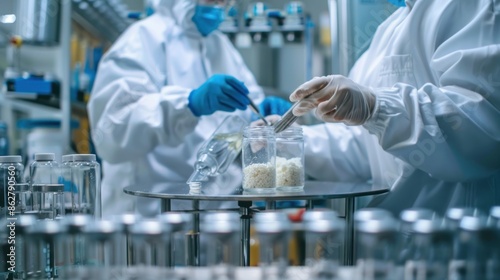 Workers mixing and blending pharmaceutical ingredients in sterile environments, ensuring precise formulation and dosage ,
