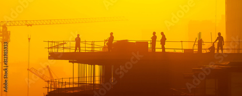 Workers on a construction site at sunset