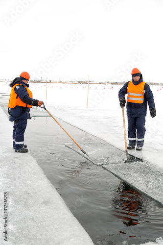 Workers rafting ice blocks along a channel cut out by a frozen lake