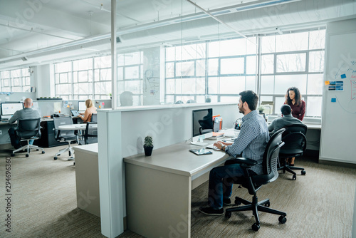 Workers using computers in office