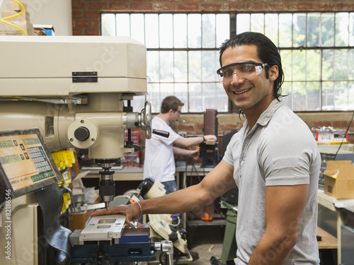 Workers using machinery in machine shop