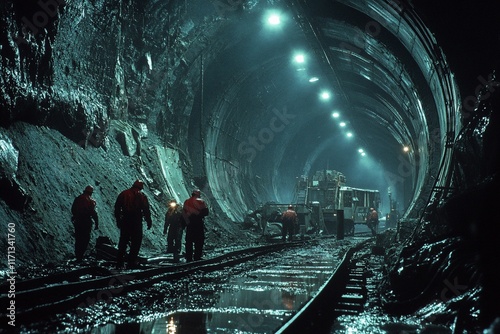 Workers walking on railway tracks in a dark, lit tunnel under construction.