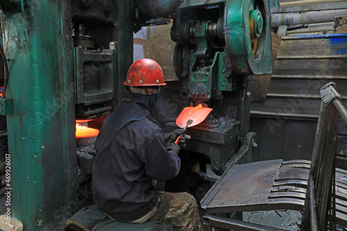 workers work on the steel shovel hot forming production line, China
