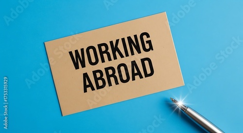 Working abroad message on a card with pen on blue surface concept